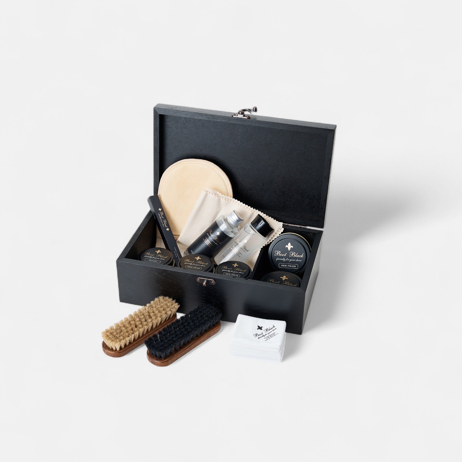 Indulge in the art of leather maintenance with the Boot Black Black Velvet Set. This exquisite kit encompasses a curated selection of high-quality products, each formulated to deliver exceptional care for your leather items. Whether you're maintaining luxury boots, designer handbags, or fine leather shoes, this set ensures a high-gloss, professional finish and long-lasting protection.